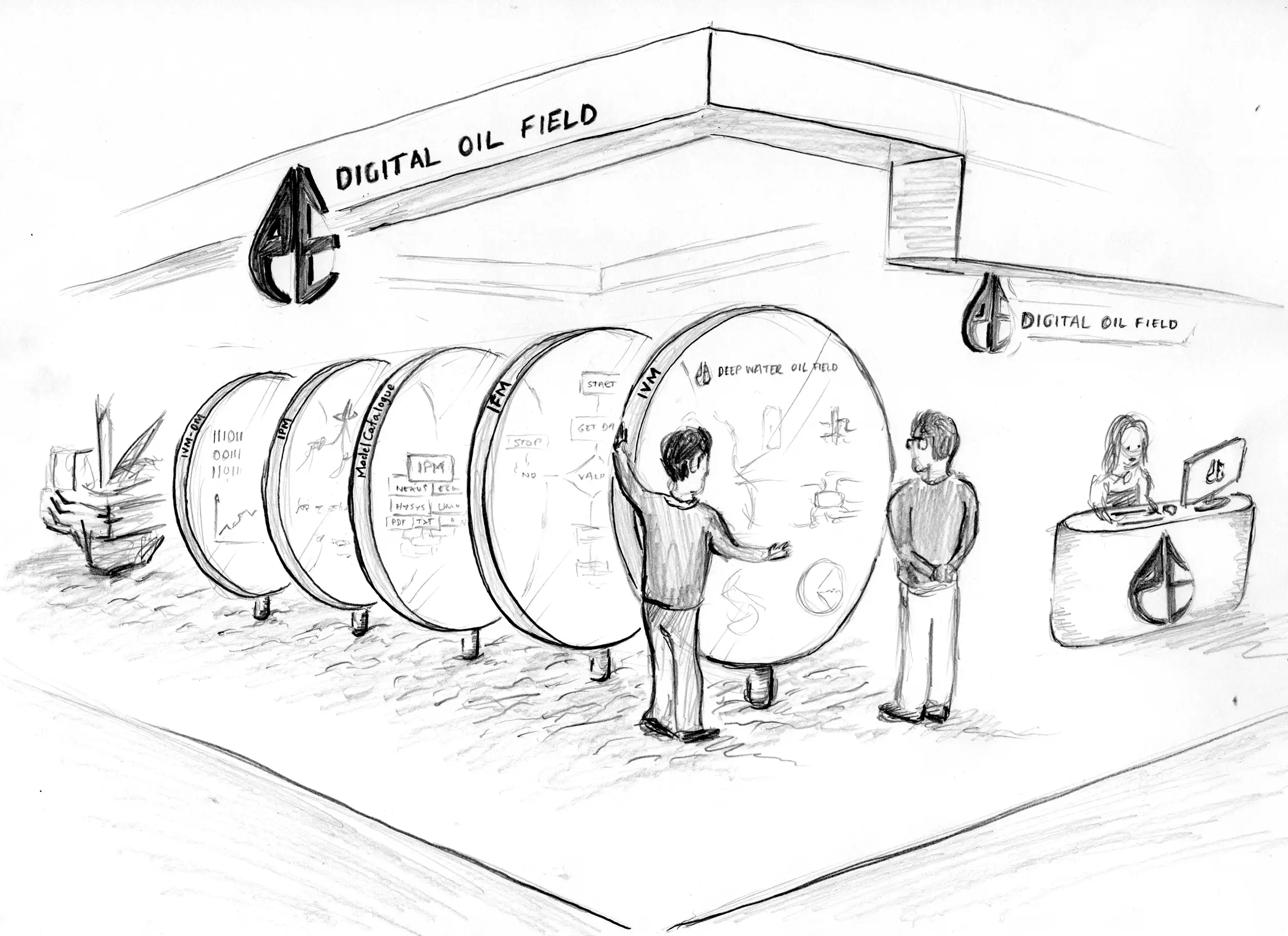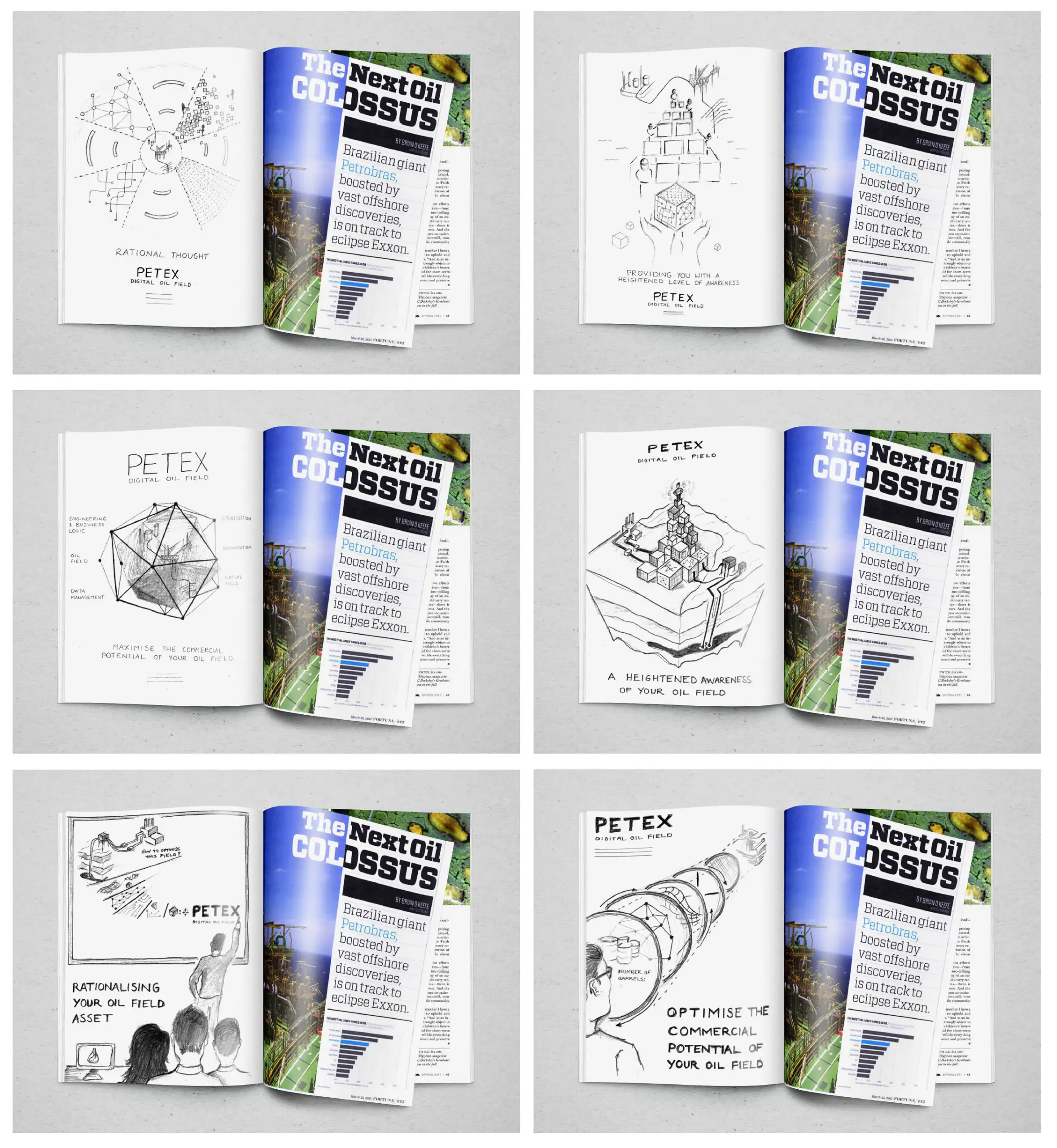 We also explored a number of other ideas, as part of our work with Petex, showcasing the company’s belief in a more integrated approach. Here we have a multi-part jigsaw showing how important that it was that all parts of the oil field fit together with each other.