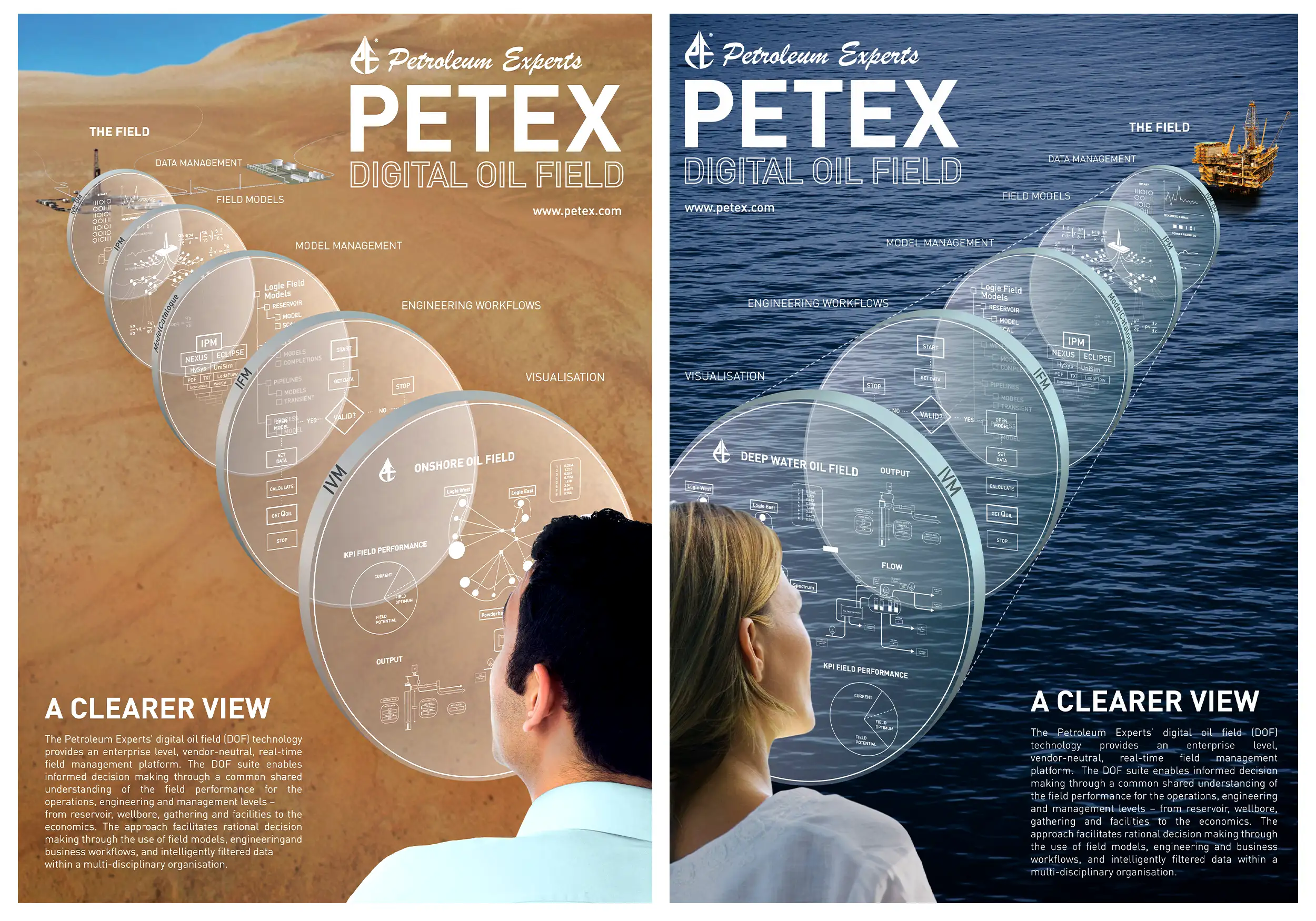 The main visual showcased an oil field with the 5 lenses of a telescope directed towards the oil-well. The 5 lenses on the visual have been designed to reflect the 5 layers of Petex’s Digital Oil Field with each one giving the viewer ‘a clearer view’ of the commercial potential of their digital oil-field asset.