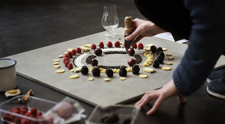 The many ingredients from the tasting notes – peppers, liquorice, dried fruit, creamy blue cheese, cherries, brambles, grain and salt, etc were all geometrically formed in a circle like a clock.