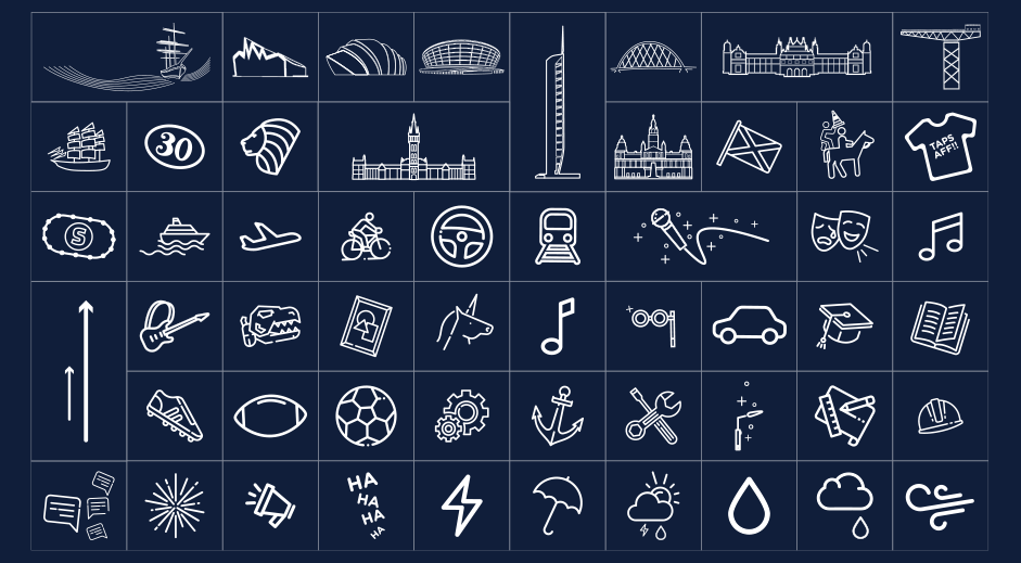 However, instead of slavishly including every single landmark we could think of, we mixed our illustrations with elements of classic Glasgow culture – laughter, music, even the famous Glasgow weather. This created a more personalised type of logo.