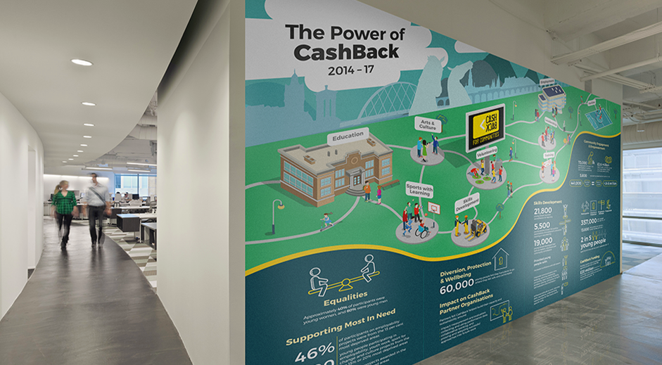 The ‘Cashback’ infographic has been tremendously well-received by the team at Inspiring Scotland. It can be found framed on the walls of the Scottish Parliament and has also been used by the organisation as part of their wider marketing.