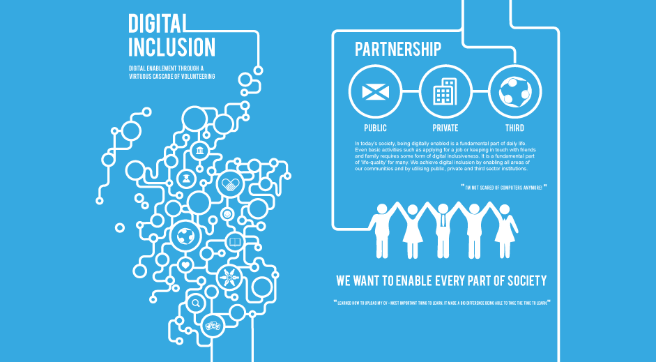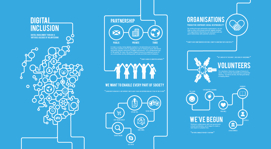 We worked closely with Seric Systems and IBM to create an infographic. We were inspired by a Scotland where every citizen is ‘digitally-enabled’ and the final infographic is divided into a number of sections that highlight the nature of the problem and the steps that can be taken.