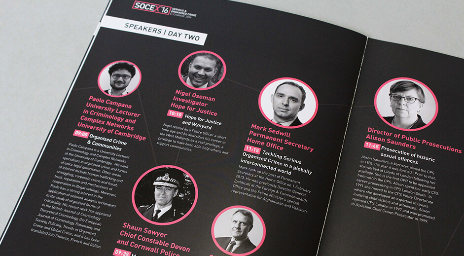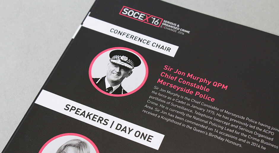 SOCEX (The Serious & Organised Crime Exchange) is a highly influential national forum designed to bring the law-enforcement community together. The event was in its second year and as the creators of the original brand, we were delighted to be given the opportunity to create the conference brochure and communications for the 2016 event.