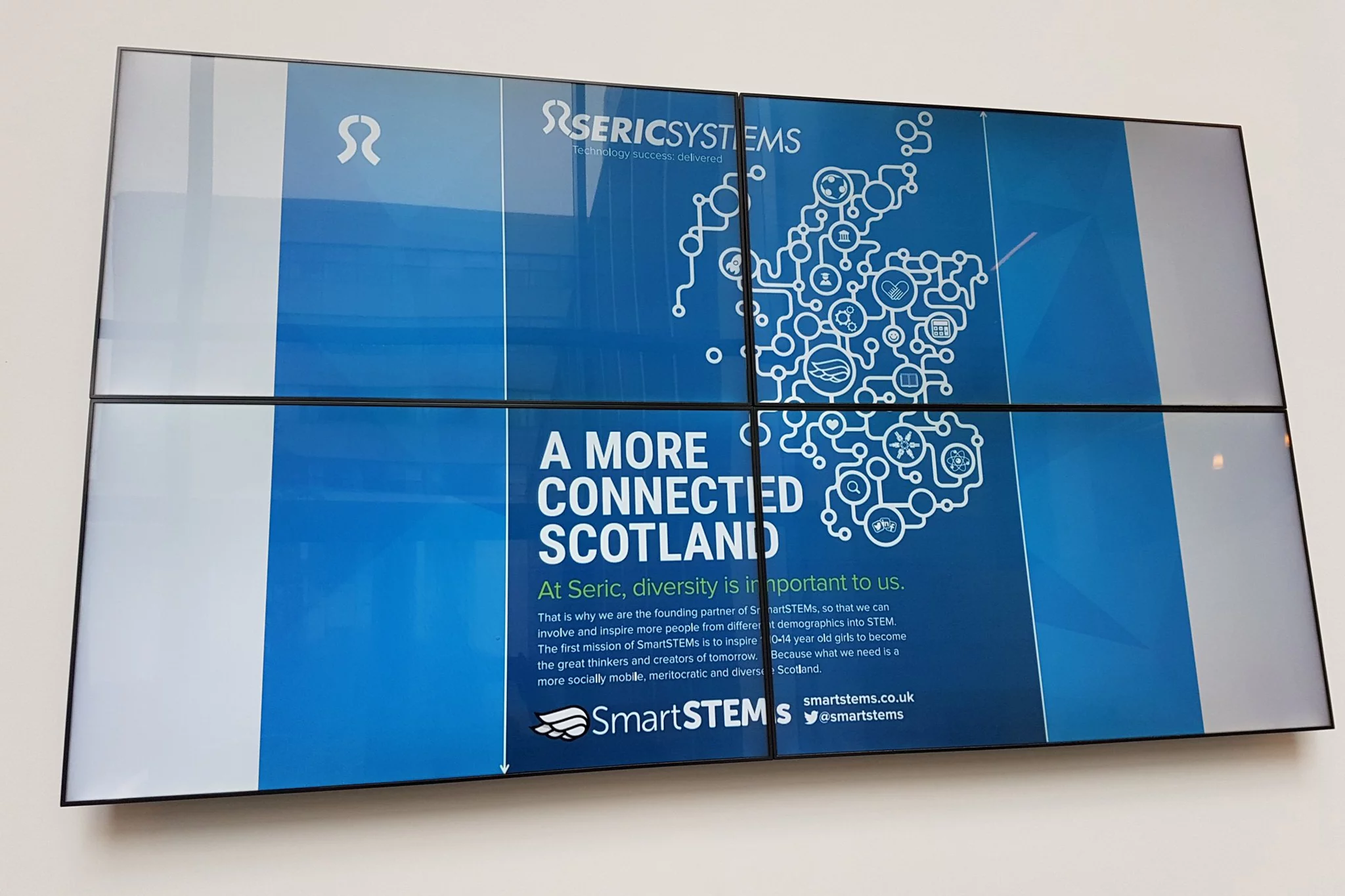 Our magnificent team put together a wonderful visual of a Scotland re-created as nodes and links, imaginatively including several icons to communicate important ideas such as diversity and inclusion, all underpinned with the stunning blue brand colour of Seric Systems.