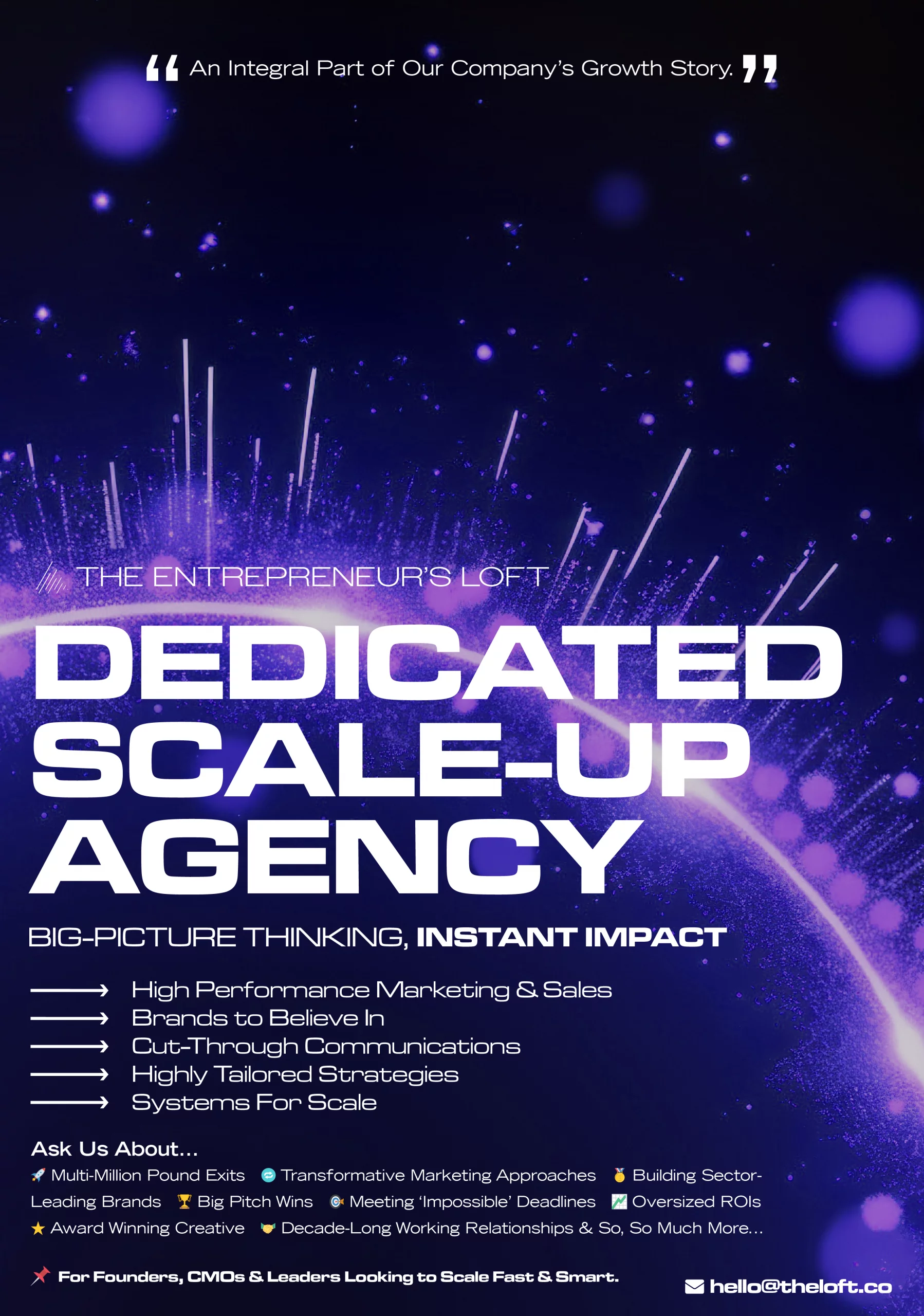 ‘The Entrepreneurs LOFT’ is a spin-out of THE LOFT Branding Agency. It’s taking all our skills and experiences, built-up over a decade, and putting them at the service of scale-up founders, leaders and their teams. It’s being respectful of the fact that every scale-up journey is unique, every Founder is different, every ‘road to Rome’ is different. Whether it’s creating brands that build a community, driving sales to the absolute maximum, finding imaginative ways to communicate value or just helping good people to retain other good people.